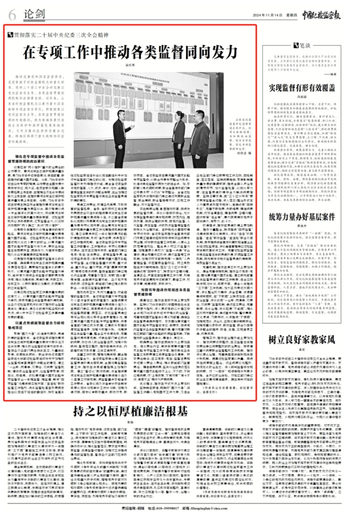 2024年11月14日,《中國紀檢監(jiān)察報》論劍版、中央紀委國家監(jiān)委網(wǎng)站要聞刊發(fā)山東省委常委、省紀委書記、省監(jiān)委主任夏紅民署名文章《在專項工作中推動各類監(jiān)督同向發(fā)力》。全文如下在專項工作中推動各類監(jiān)督同向發(fā)力 山東省...